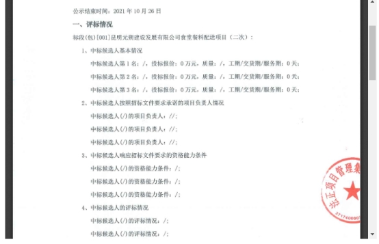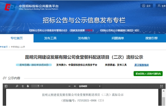 昆明元朔建设发展有限公司食堂餐料配送项目(二次)竞争性谈判流标公示