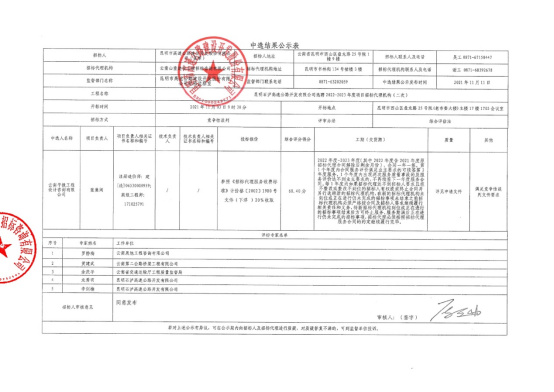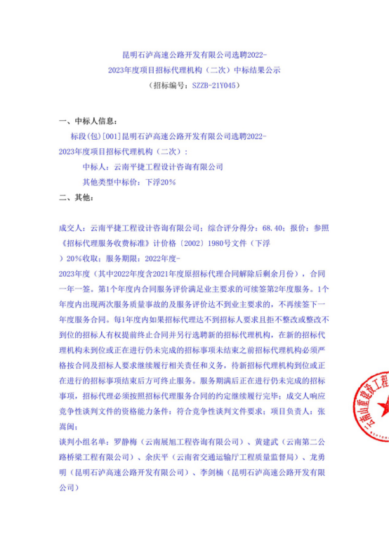 昆明石泸高速公路开发有限公司选聘2022-2023年度项目招标代理机构(二次)中标结果公示