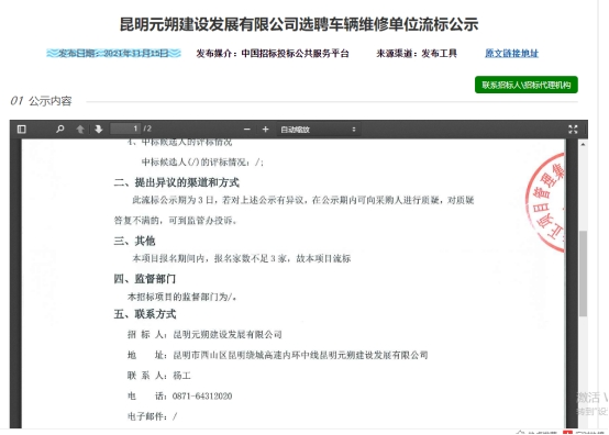 昆明元朔建设发展有限公司选聘车辆维修单位竞争性谈判流标公示