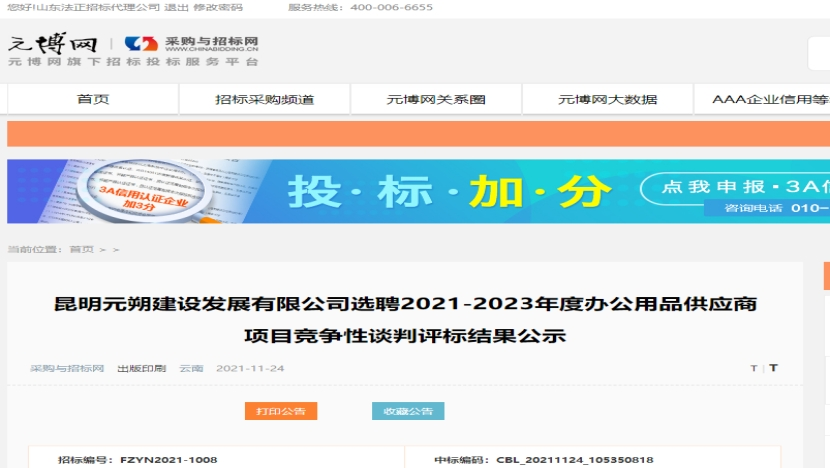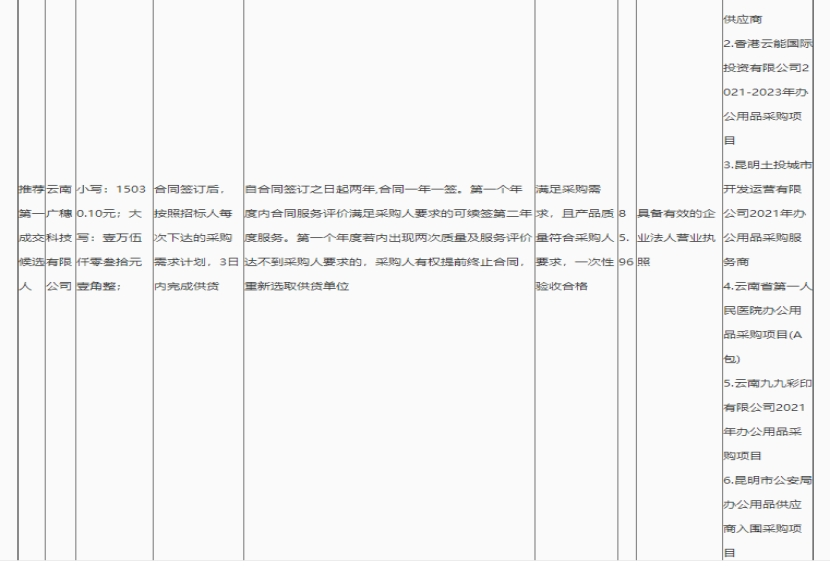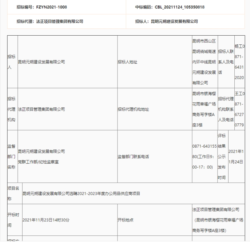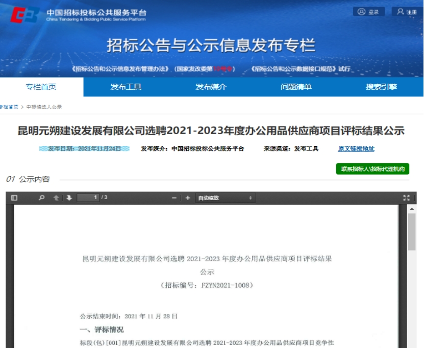 昆明元朔建设发展有限公司选2021-2023年度办公用品供应商项目评标结果公示