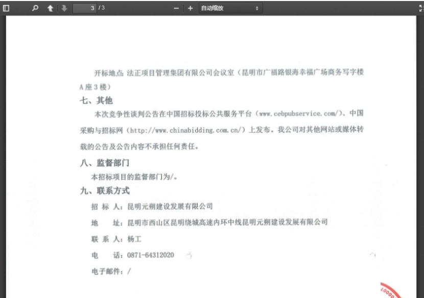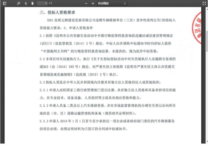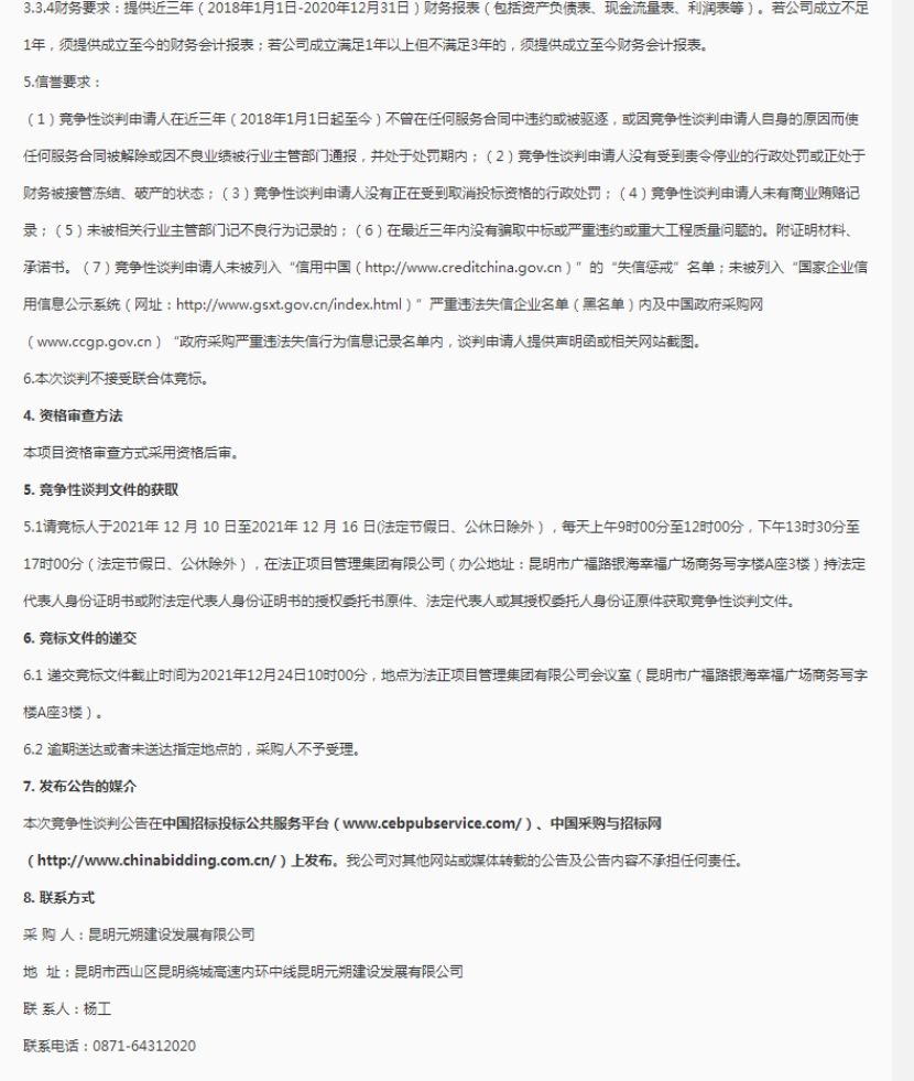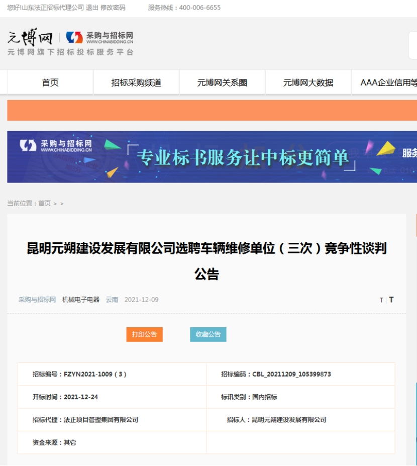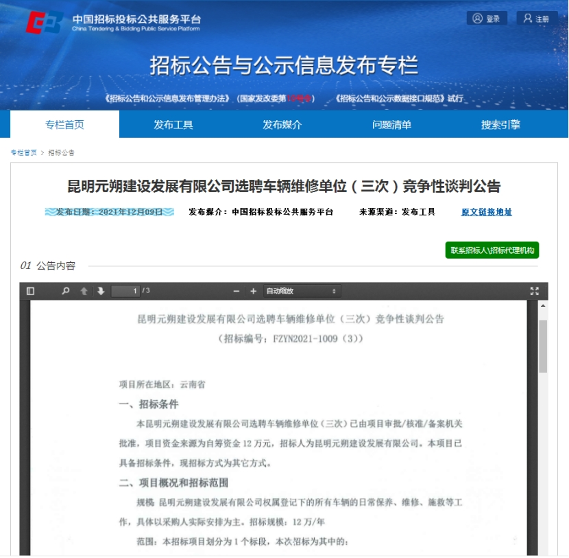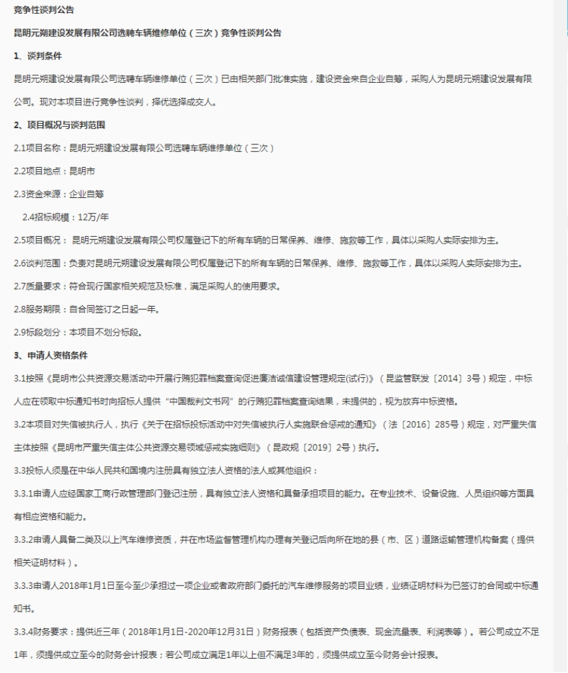 昆明元朔建设发展有限公司车辆维修竞争性谈判(三次)公告发布信息