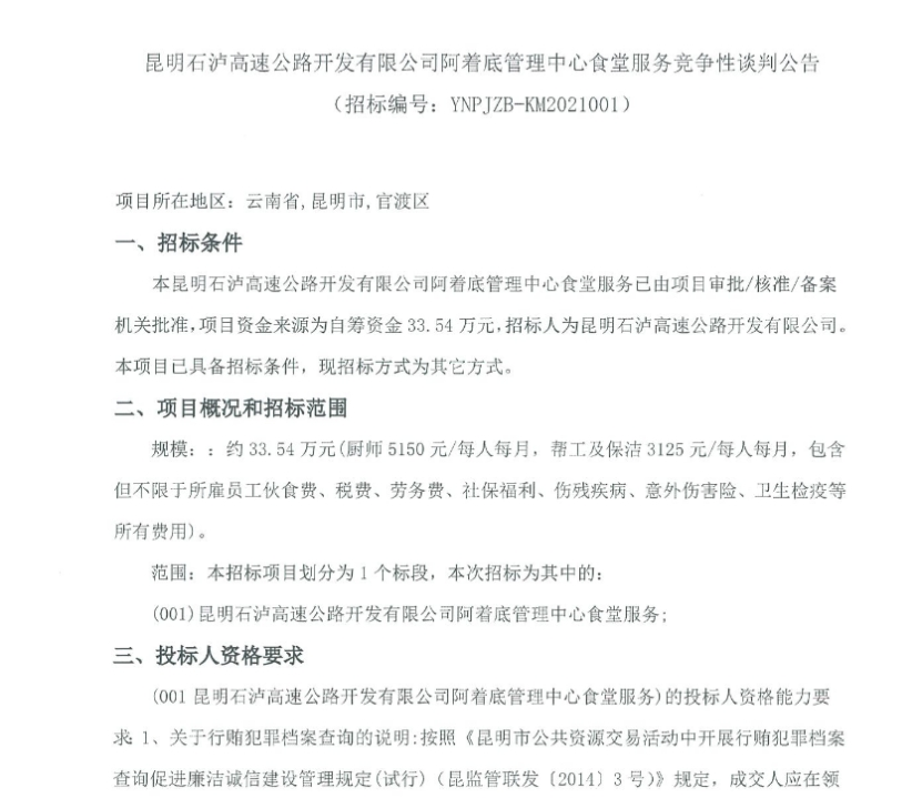 昆明石泸高速公路开发有限公司阿着底管理中心食堂服务竞争性谈判公告