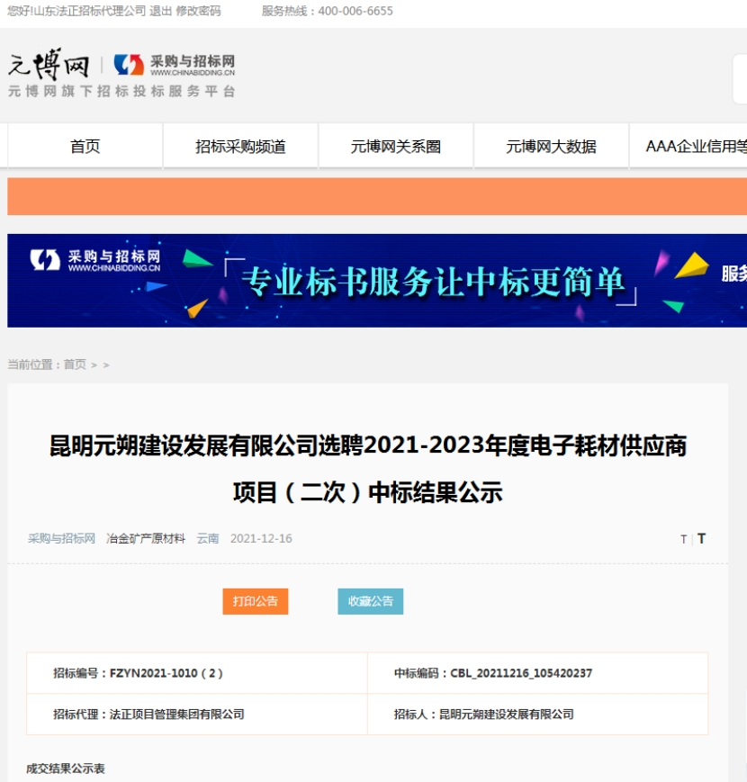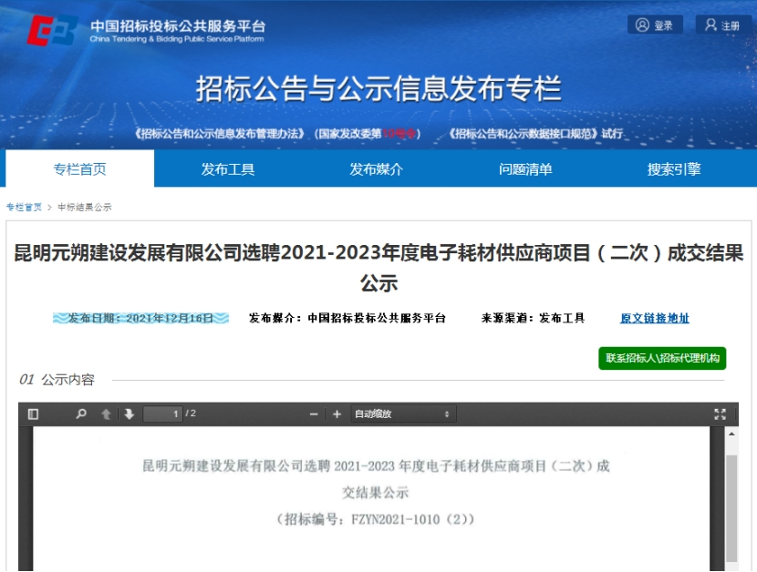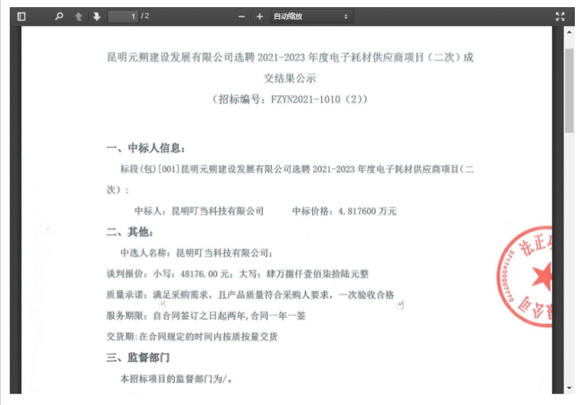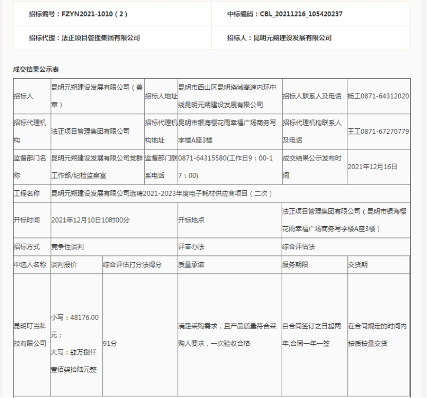 昆明元朔建设发展有限公司选聘电子耗材供应商竞争性谈判(二次)成交结果公示