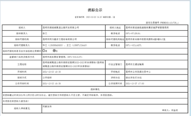 昆明绕城高速公路东南段运营期2022-2023年安保服务流标公示