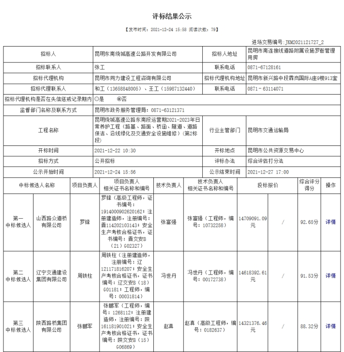 昆明绕城高速公路东南段运营期2021-2023年日常养护工程(路基、路面、桥涵、隧道、道路保洁、沿线绿化及交通安全设施维修)第2标段评标结果公示