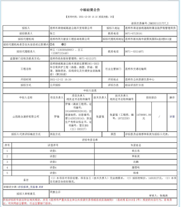 昆明绕城高速公路东南段运营期2021-2023年日常养护工程(路基、路面、桥涵、隧道、道路保洁、沿线绿化及交通安全设施维修)第2标段中标结果公告