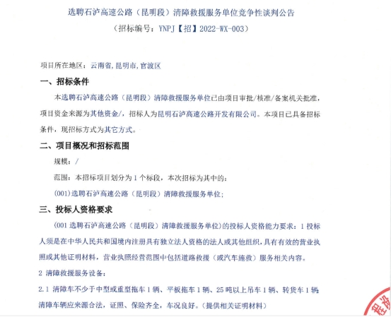 选聘石泸高速公路(昆明段)清障救援服务单位竞争性谈判公告