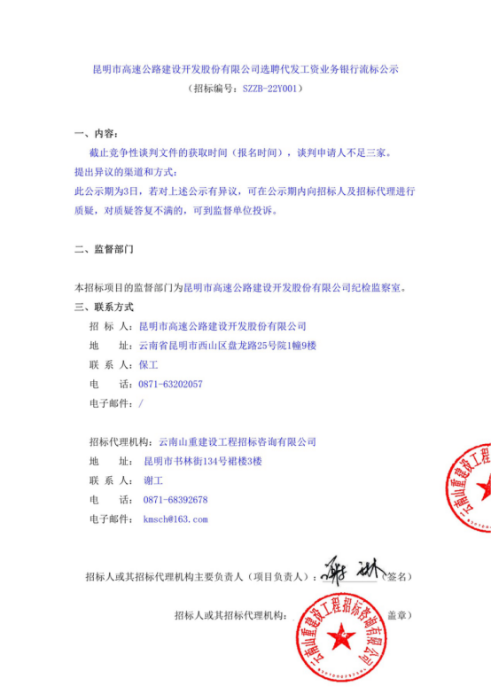昆明市高速公路建设开发股份有限公司选聘代发工资业务银行流标公示