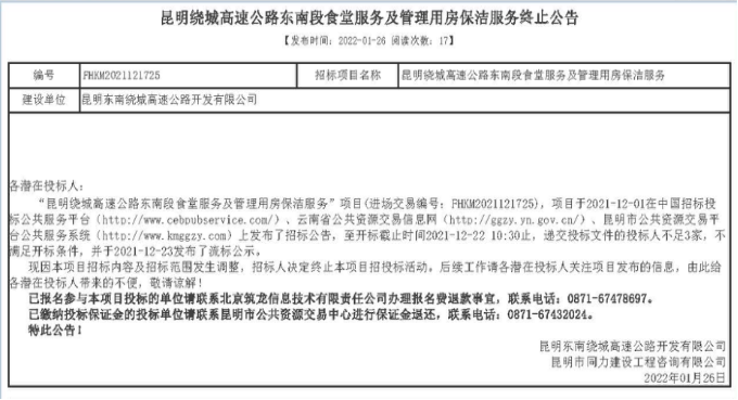 昆明绕城高速公路东南段食堂服务及管理用房保洁服务终止公告