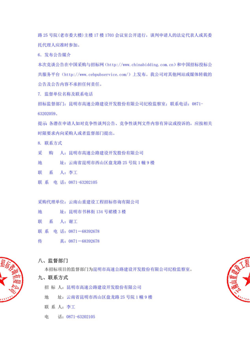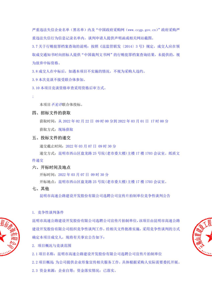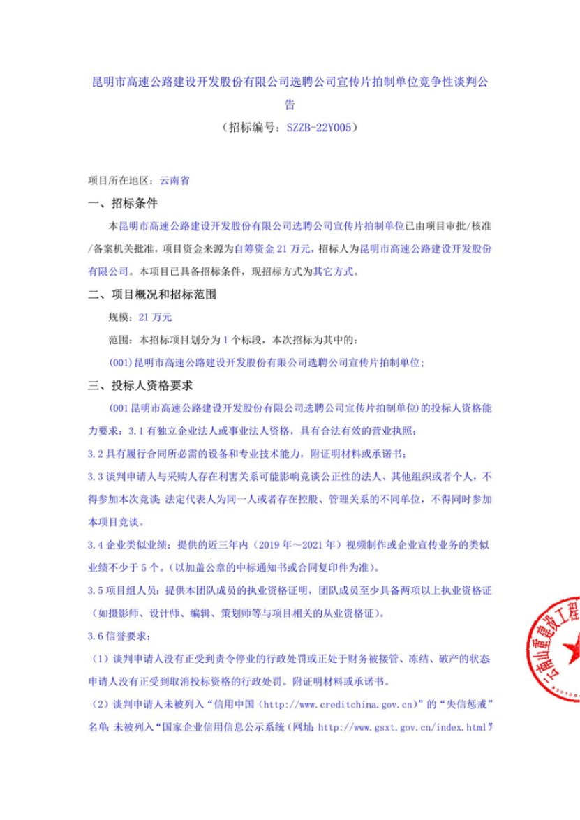 昆明市高速公路建设开发股份有限公司选聘公司宣传片拍制单位竞争性谈判公告
