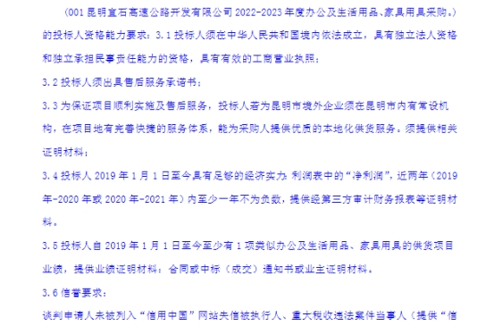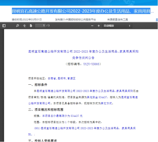 昆明宜石高速公路开发有限公司2022-2023年度办公及生活用品、家具用具采购竞争性谈判公告