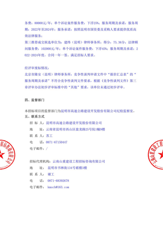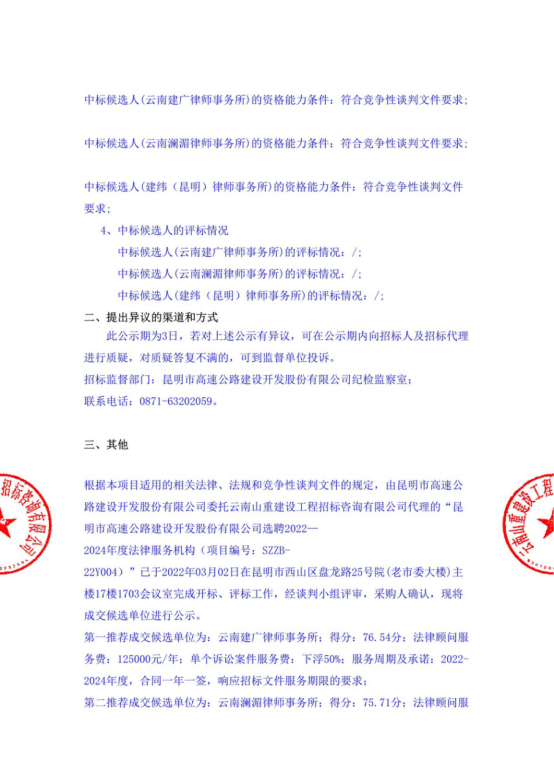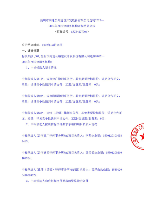昆明市高速公路建设开发股份有限公司选聘2022—2024年度法律服务机构评标结果公示