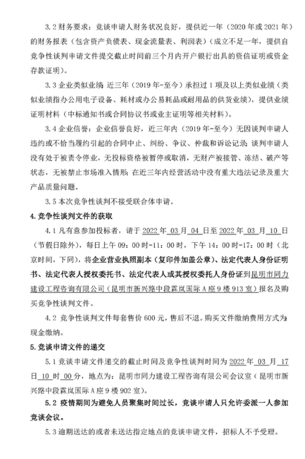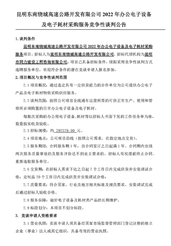 昆明东南绕城高速公路开发有限公司2022年办公电子设备及电子耗材采购服务竞争性谈判公告