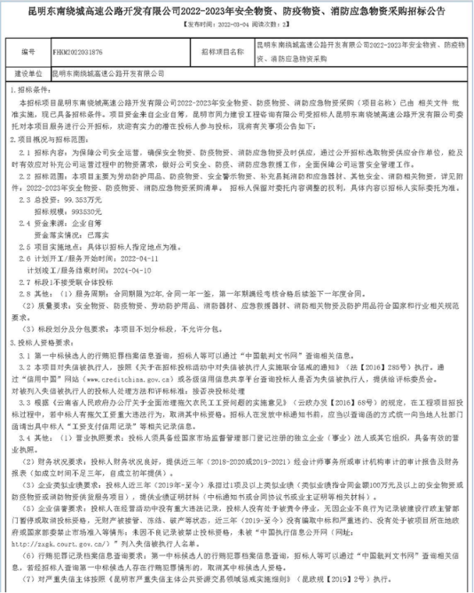 昆明东南绕城高速公路开发有限公司2022-2023年安全物资、防疫物资、消防应急物资采购招标公告