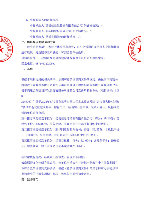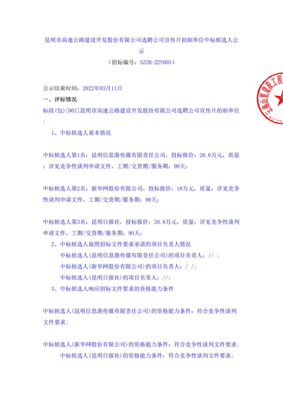 昆明市高速公路建设开发股份有限公司选聘公司宣传片拍制单位中标候选人公示