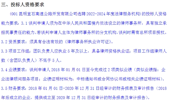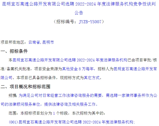 昆明宜石高速公路开发有限公司选聘2022-2024年度法律服务机构竞争性谈判公告