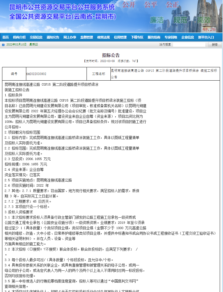昆明南连接线高速公路COP15第二阶段道路提升项目桥梁涂装施工招标公告【昆明市公共资源交易中心(新平台),点击可查看】