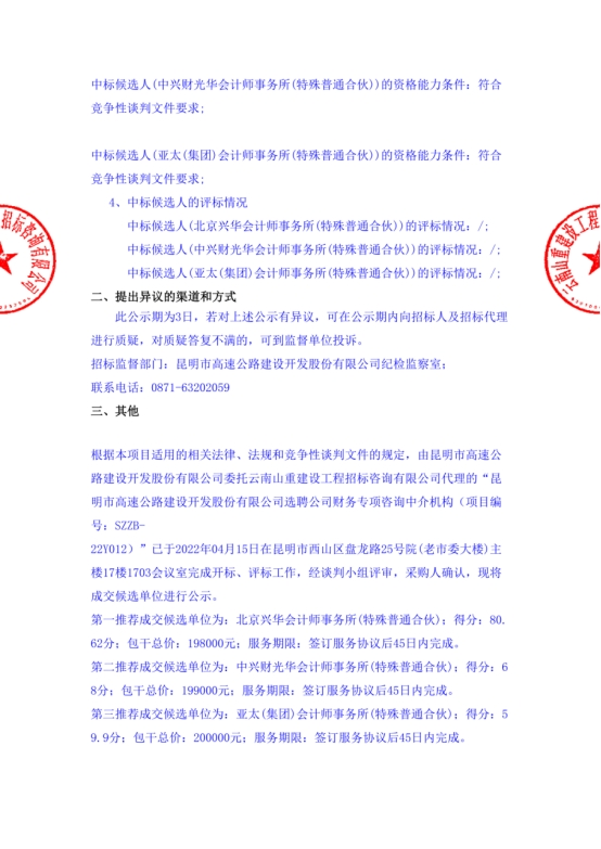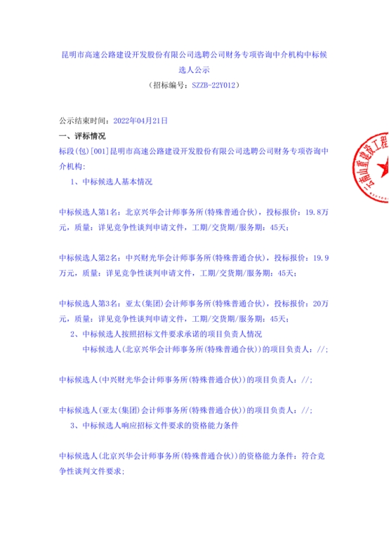昆明市高速公路建设开发股份有限公司选聘公司财务专项咨询中介机构中标候选人公示