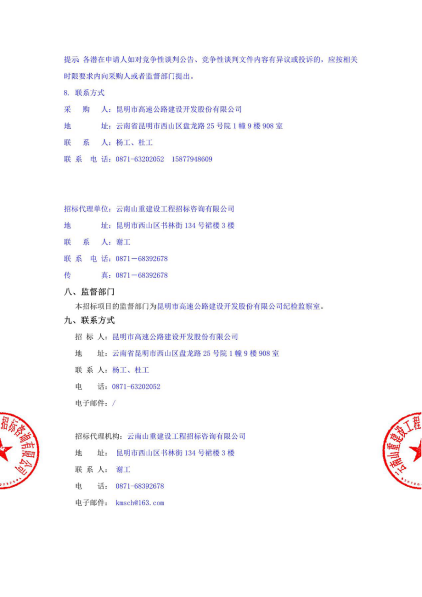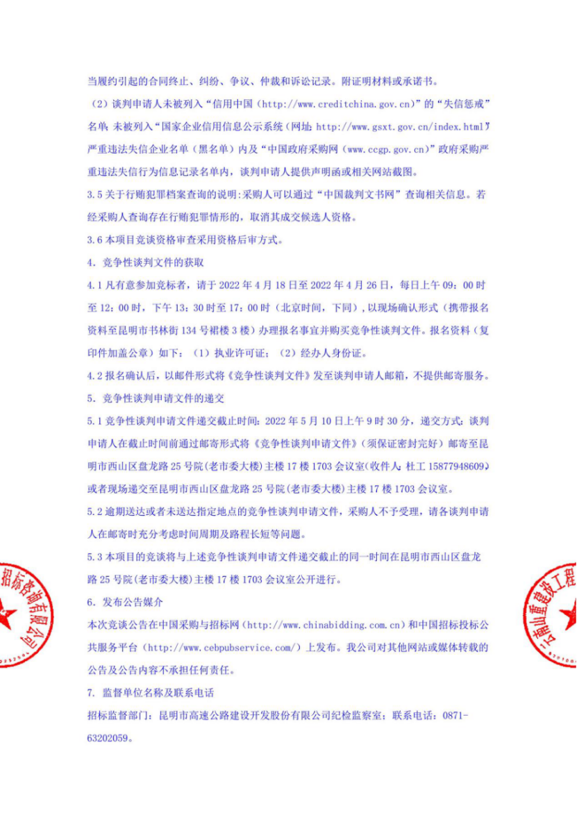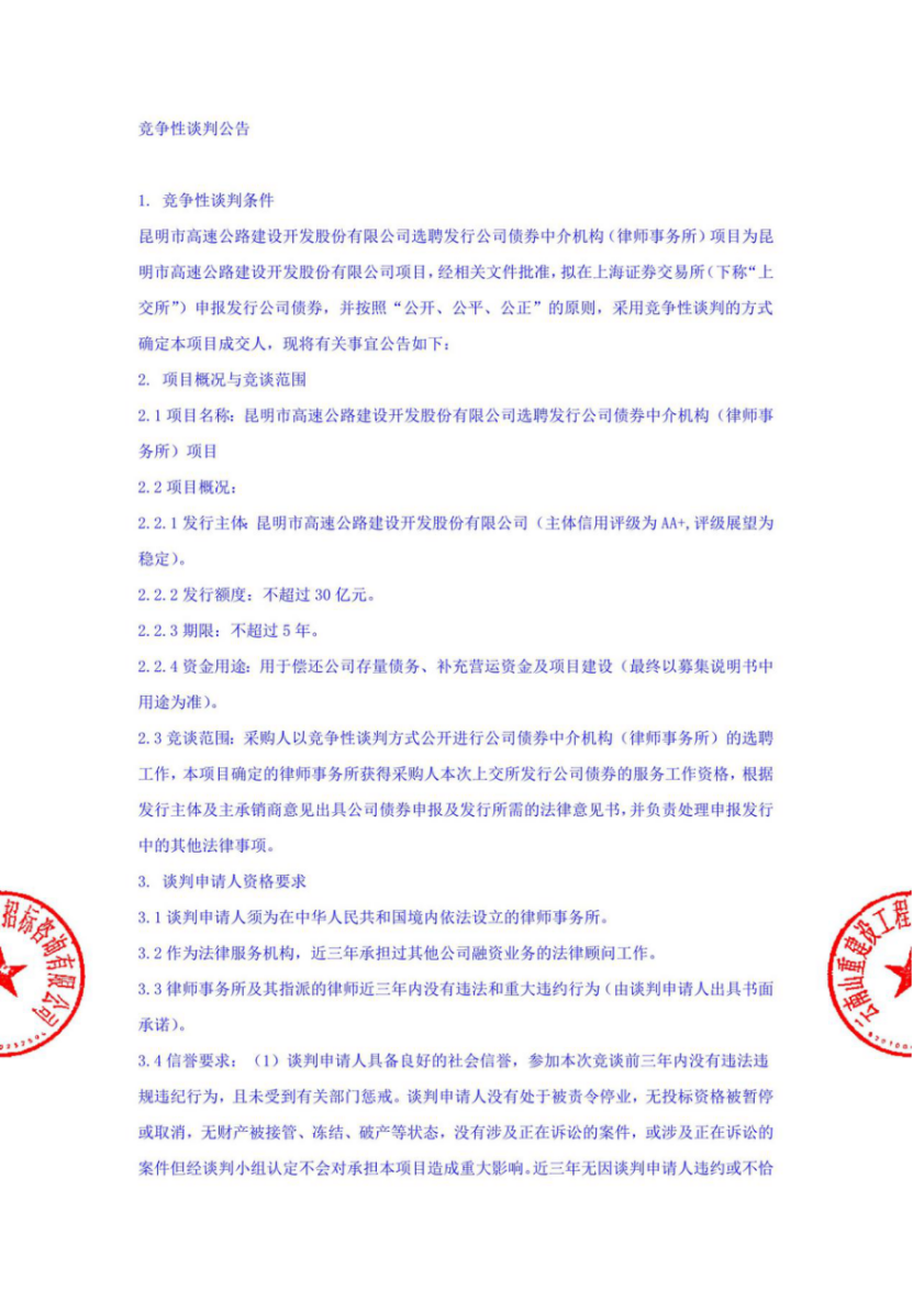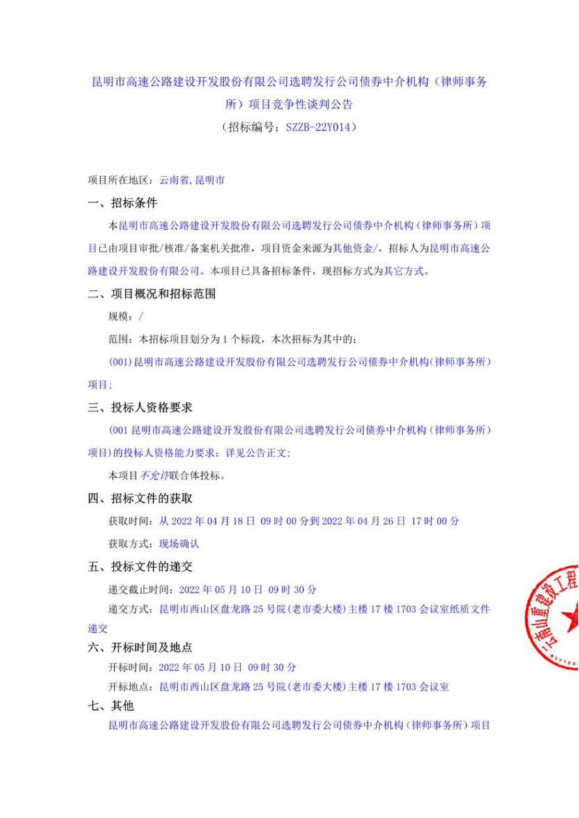 昆明市高速公路建设开发股份有限公司选聘发行公司债券中介机构(律师事务所)项目竞争性谈判公告(2022年)