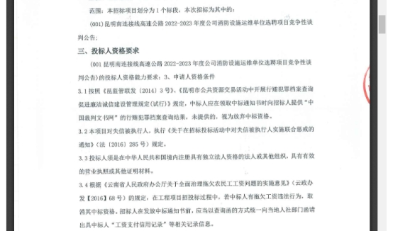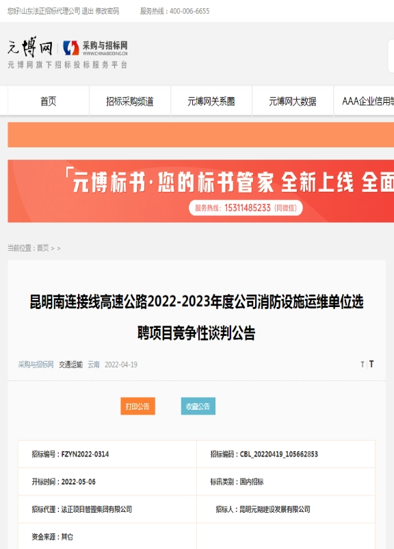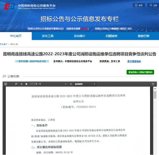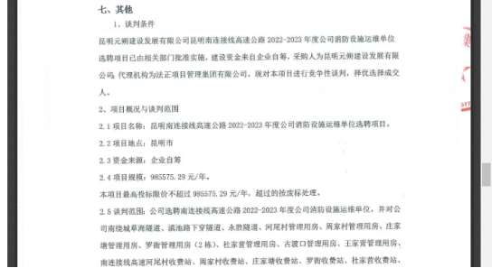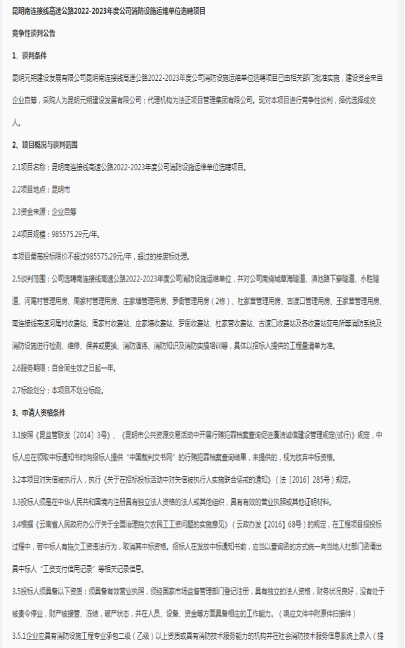 昆明南连接线高速公路2022-2023年度公司消防设施运维单位选聘项目竞争性谈判公告