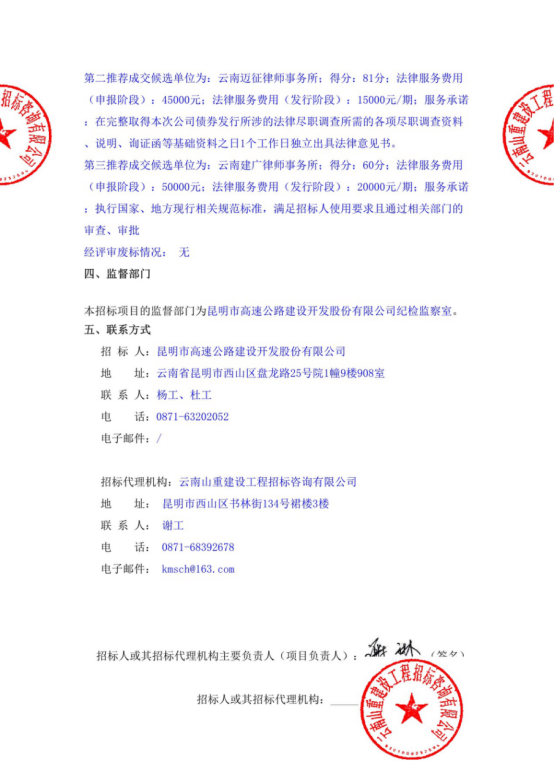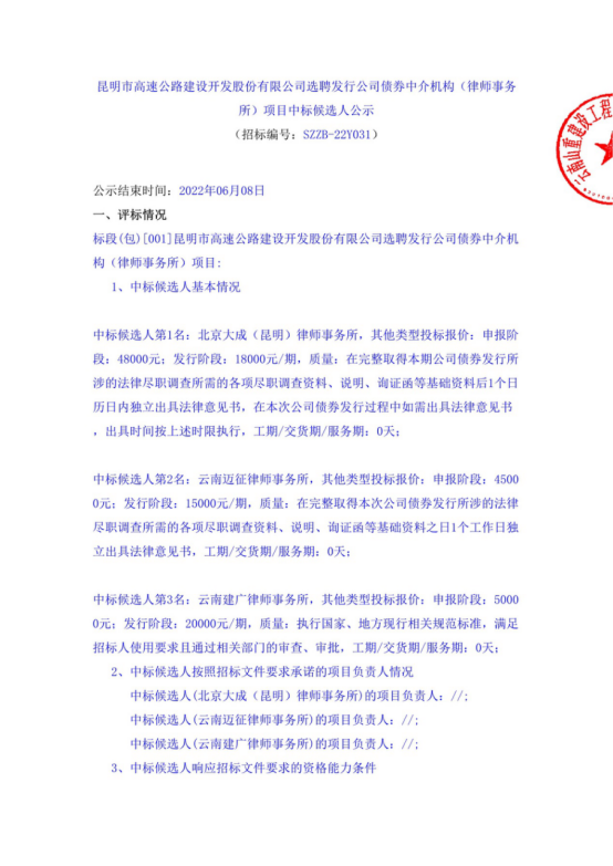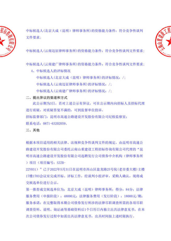 昆明市高速公路建设开发股份有限公司选聘发行公司债券中介机构(律师事务所)中标候选人公示
