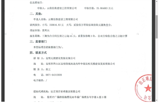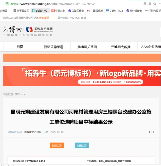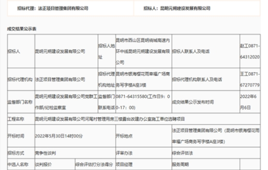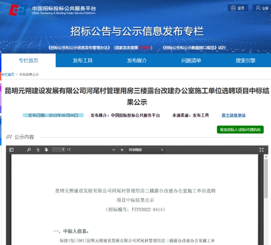 昆明元朔建设发展有限公司河尾村管理用房三楼露台改建办公室施工单位选聘项目中标结果公示