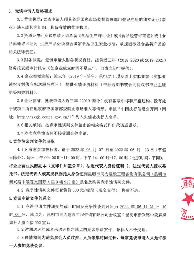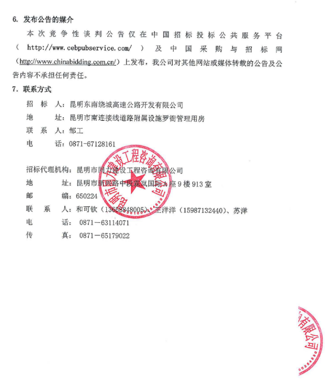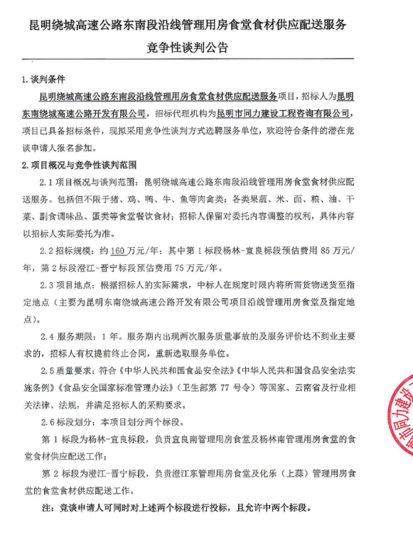 昆明绕城高速公路东南段沿线管理用房食堂食材供应配送服务竞争性谈判公告