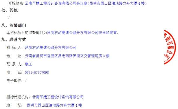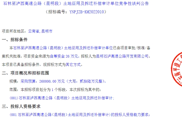 石林至泸西高速公路(昆明段)土地征用及拆迁补偿审计竞争性谈判公告