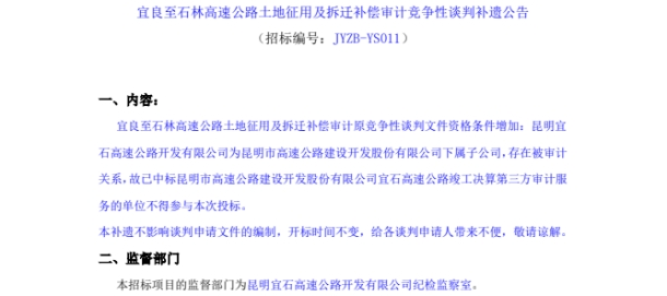 宜良至石林高速公路土地征用及拆迁补偿审计竞争性谈判公告