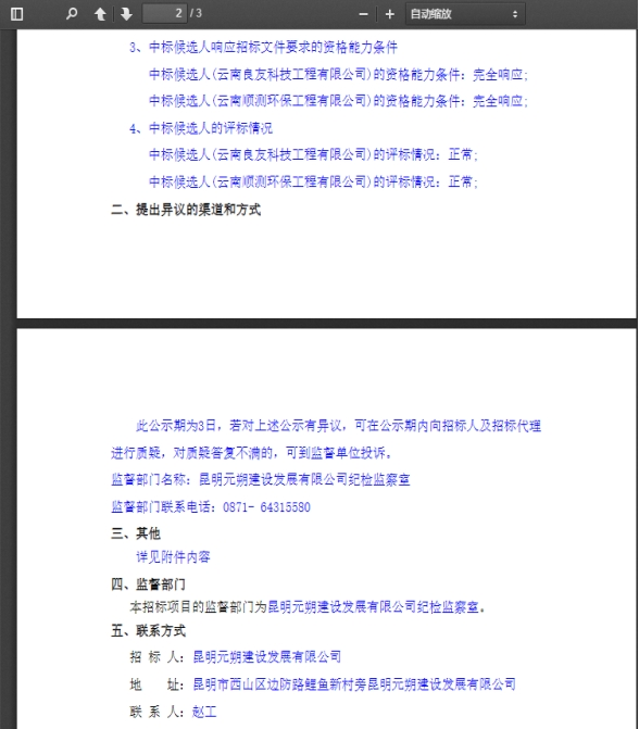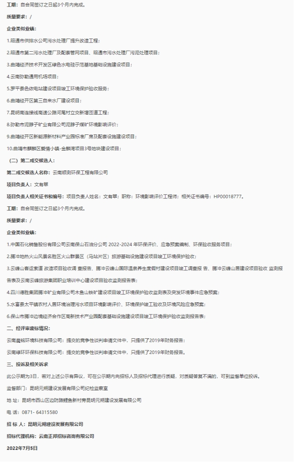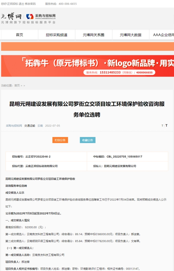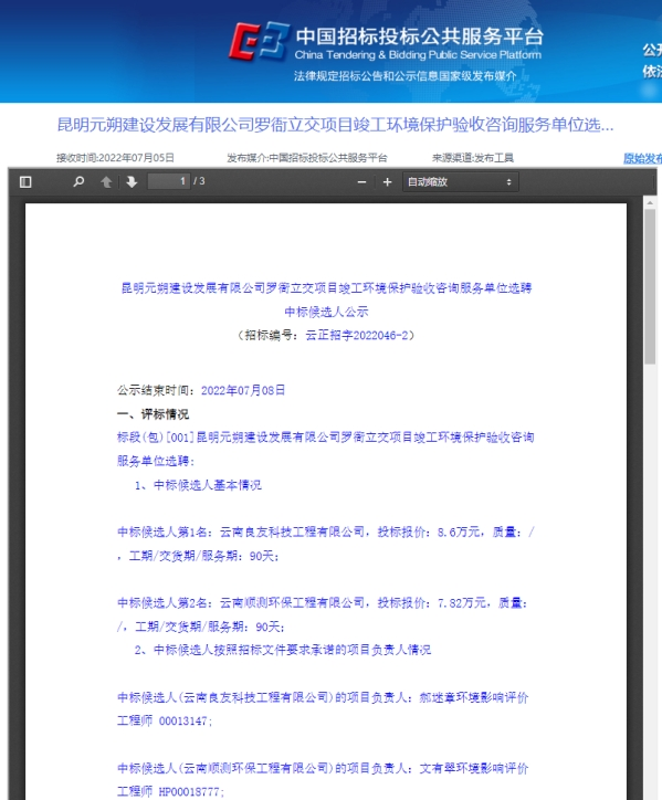 昆明元朔建设发展有限公司罗衙立交项目竣工环境保护验收咨询服务单位选聘评标结果公示