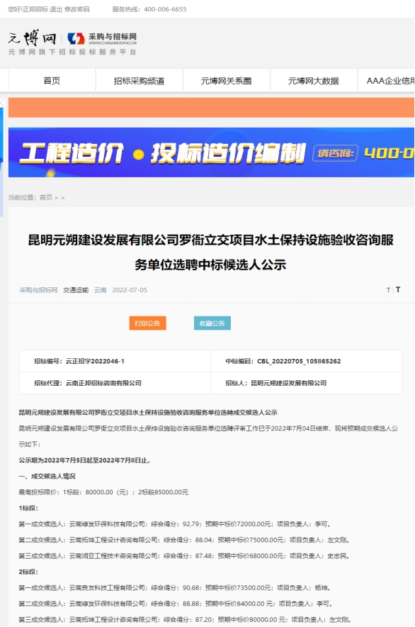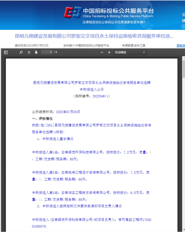 昆明元朔建设发展有限公司罗衙立交项目水土保持设施验收咨询服务单位选聘评标结果公示