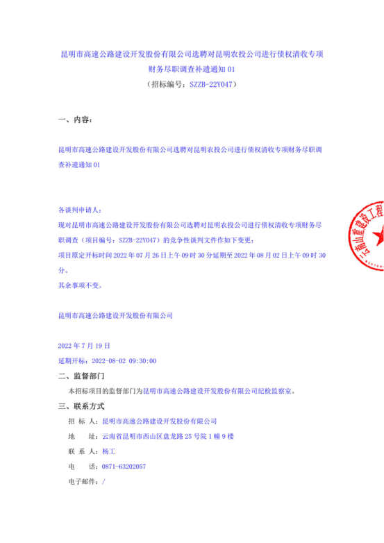 昆明市高速公路建设开发股份有限公司选聘对昆明农投公司进行债权清收专项财务尽职调查补遗通知01