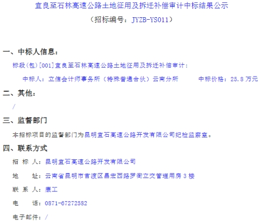 宜良至石林高速公路土地征用及拆迁补偿审计中标结果公示