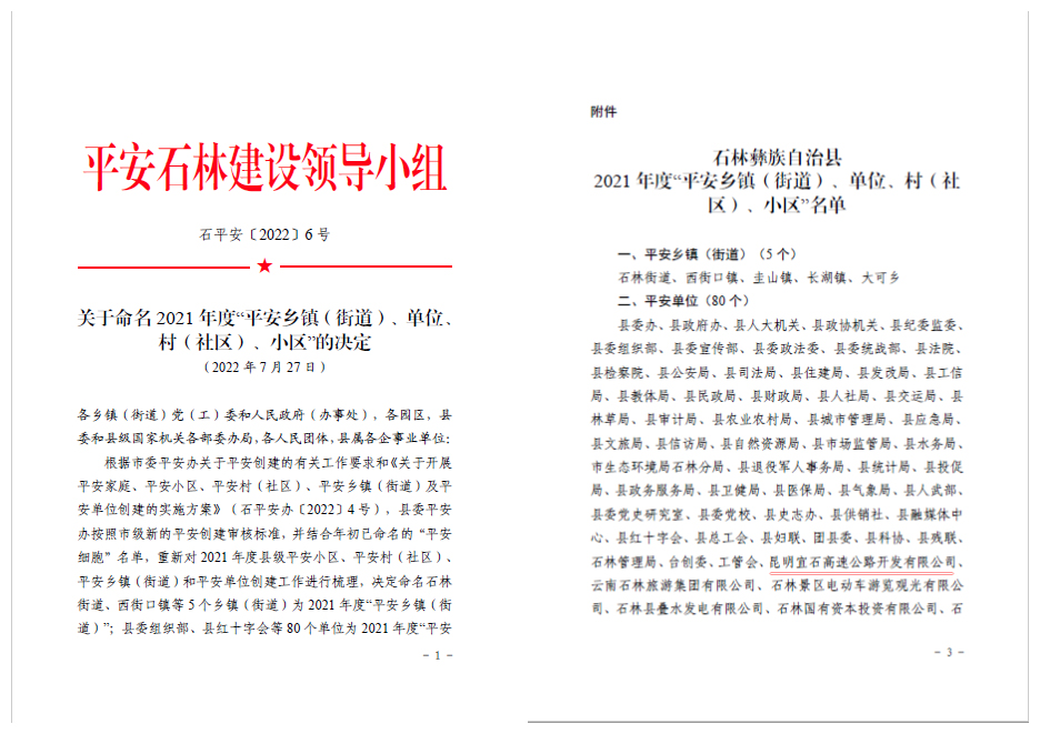 近日,昆明市高速公路建设开发股份有限公司下属昆明宜石高速公路开发有限公司被平安石林建设领导小组办公室授予2021年度“平安单位”称号。