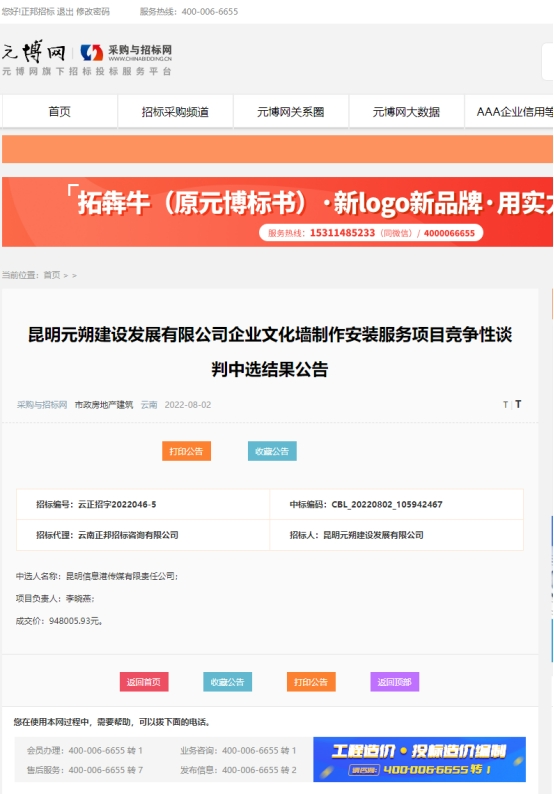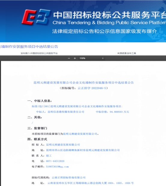 昆明元朔建设发展有限公司企业文化墙制作安装服务项目成交结果公告