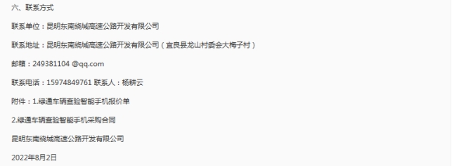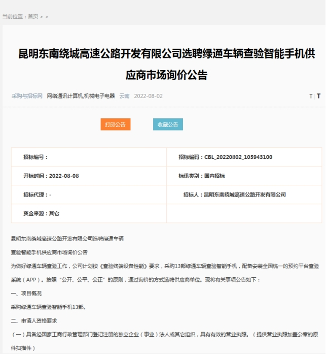 昆明东南绕城高速公路开发有限公司选聘绿通车辆查验智能手机供应商市场询价公告