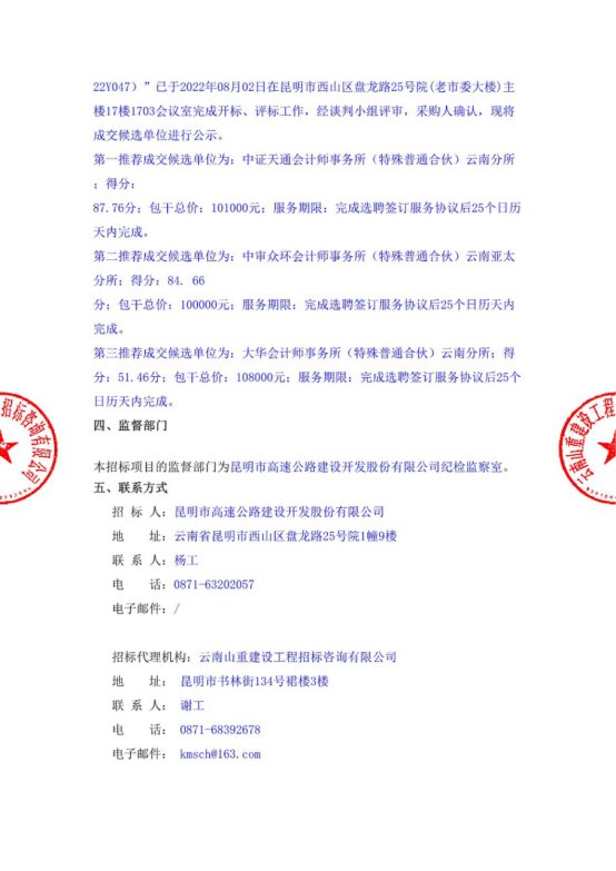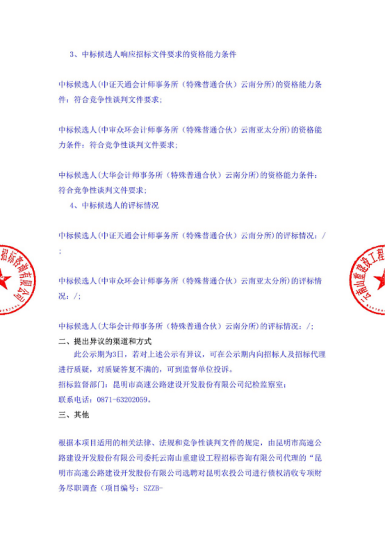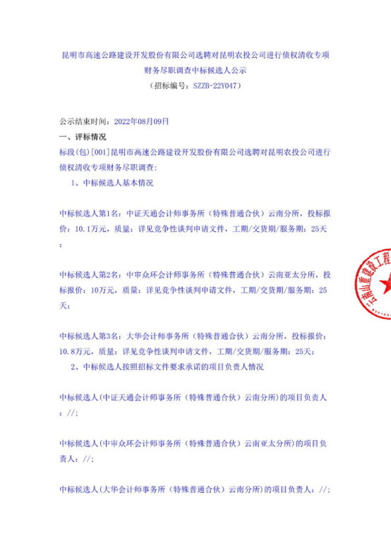昆明市高速公路建设开发股份有限公司选聘对昆明农投公司进行债权清收专项财务尽职调查中标候选人公示