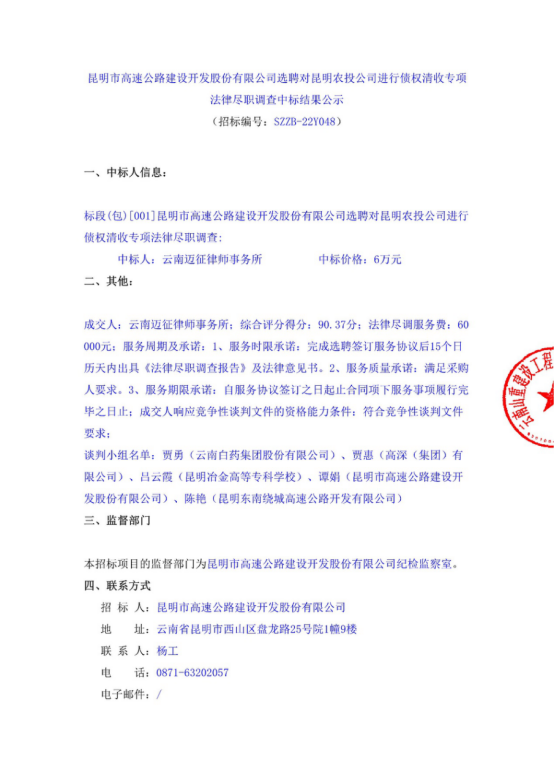 昆明市高速公路建设开发股份有限公司选聘对昆明农投公司进行债权清收专项法律尽职调查中标结果公示