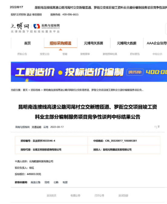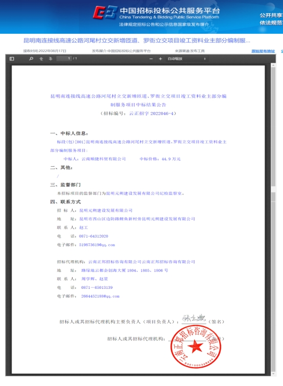 昆明南连接线高速公路河尾村立交新增匝道、罗衙立交项目竣工资料业主部分编制服务项目中标结果公告