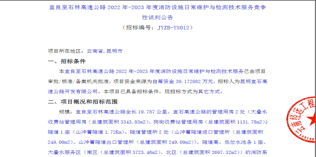 宜良至石林高速公路2022年-2023年度消防设施日常维护与 检测技术服务竞争性谈判公告