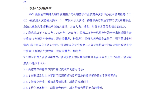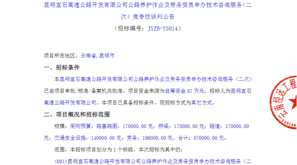 昆明宜石高速公路开发有限公司公路养护作业及劳务资质申办技术咨询服务(二次)竞争性谈判公告