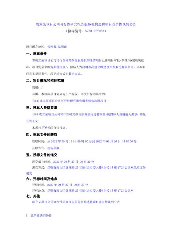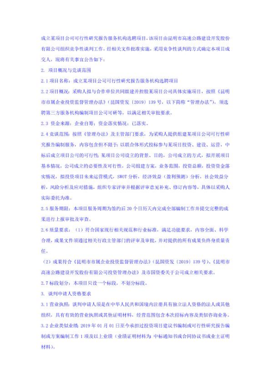 成立某项目公司可行性研究报告服务机构选聘项目竞争性谈判公告