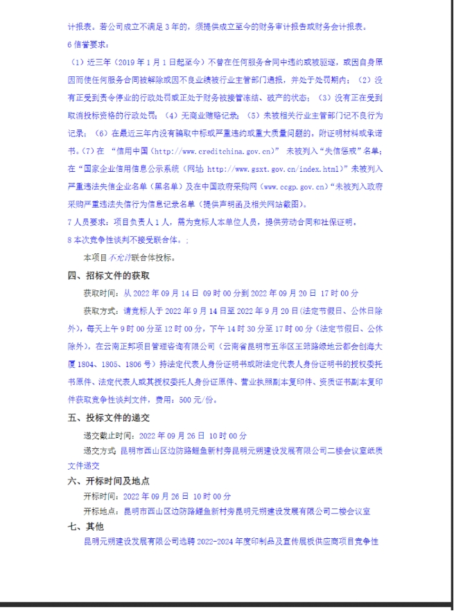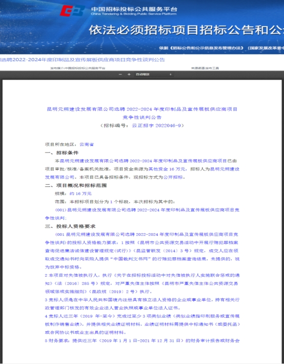 昆明元朔建设发展有限公司选聘2022-2024年度印制品及宣传展板供应商项目竞争性谈判公告