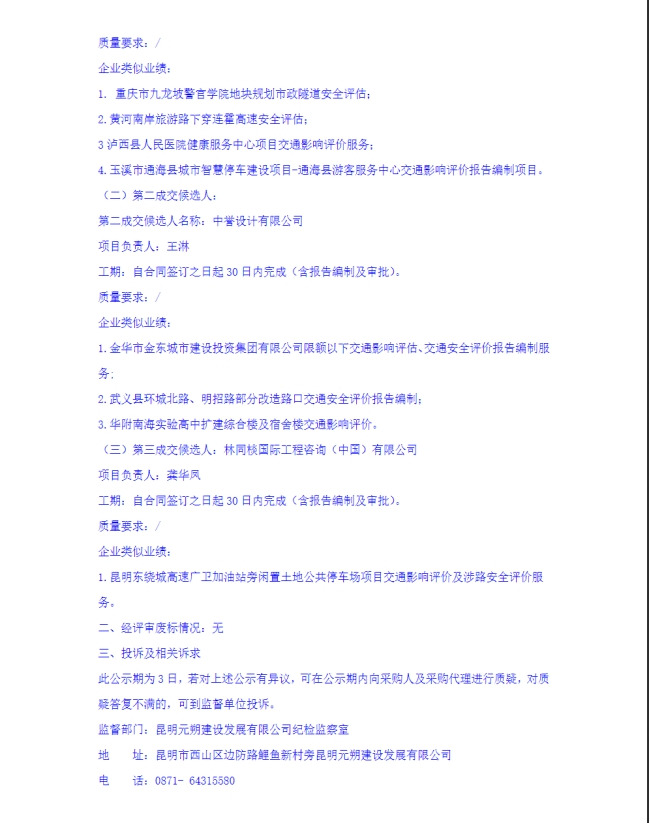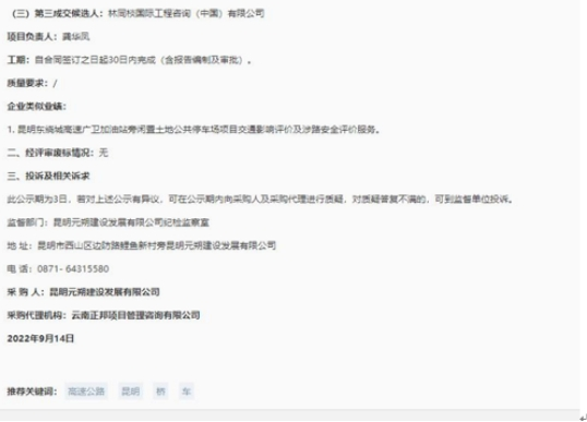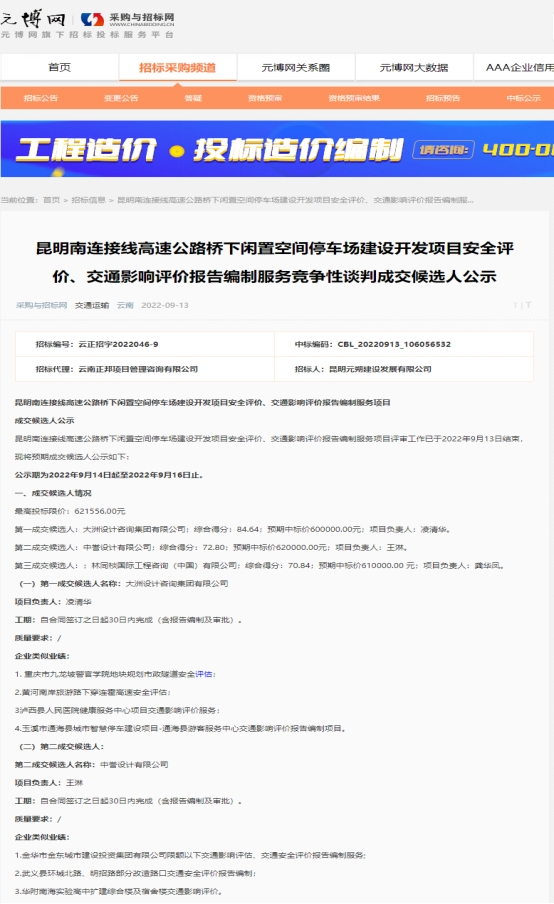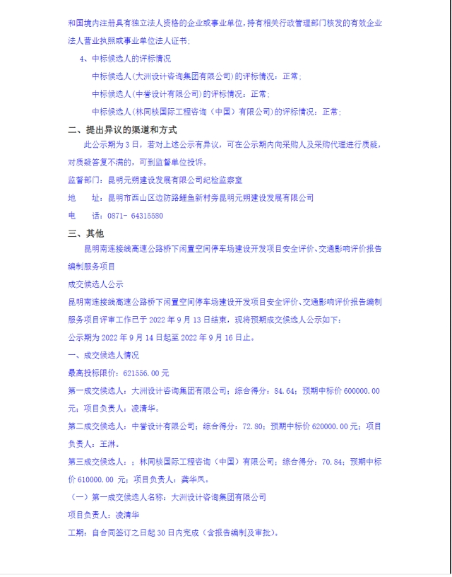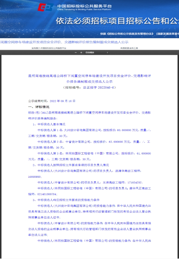 昆明南连接线高速公路桥下闲置空间停车场建设开发项目安全评价、交通影响评价报告编制服务评标结果公示