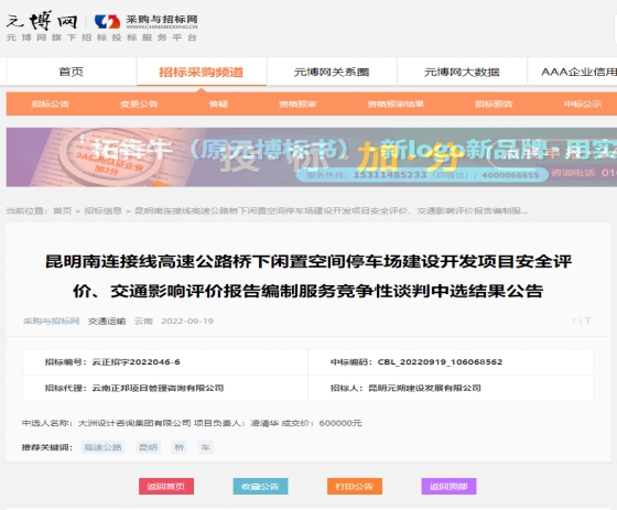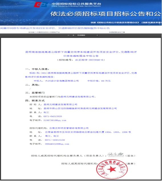 昆明南连接线高速公路桥下闲置空间停车场建设开发项目安全评价、交通影响评价报告编制服务中标结果公示