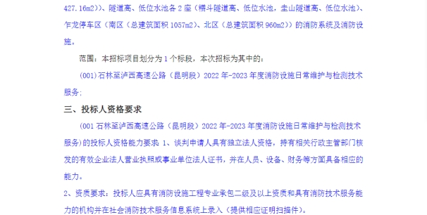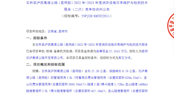 石林至泸西高速公路(昆明段)2022年-2023年度消防设施日常维护与检测技术服务(二次)竞争性谈判公告