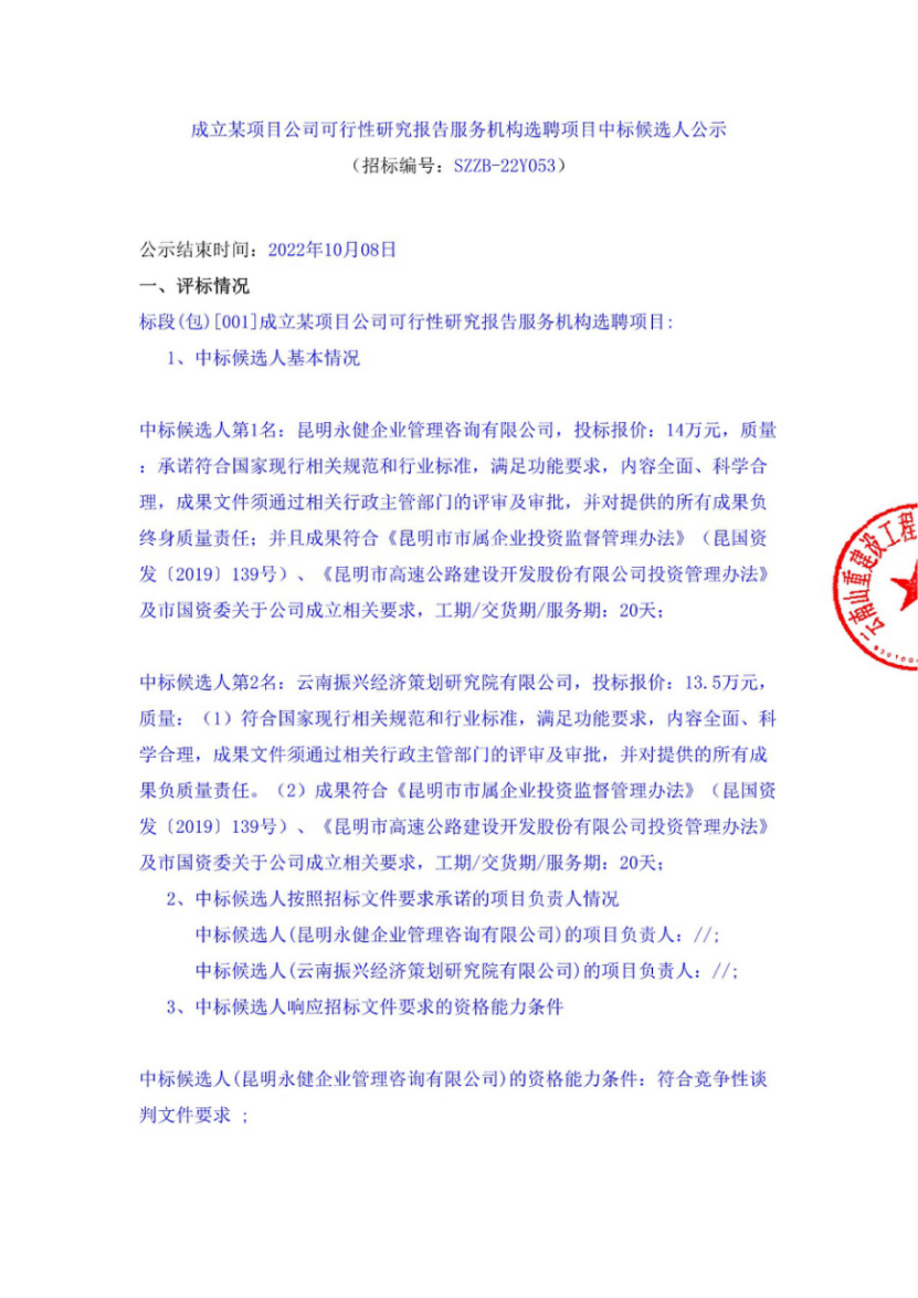 成立某项目公司可行性研究报告服务机构选聘项目中标候选人公示