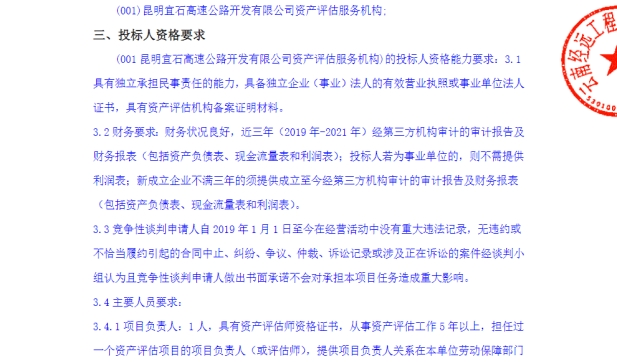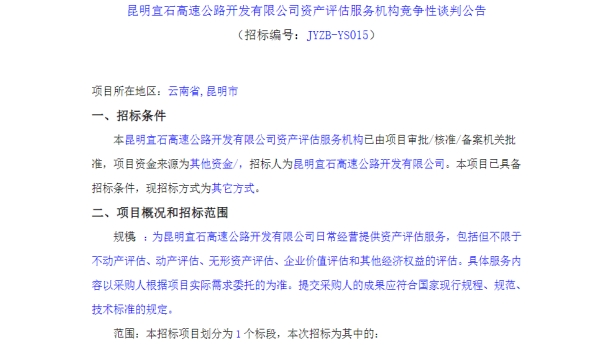 昆明宜石高速公路开发有限公司资产评估服务机构竞争性谈判文件公告