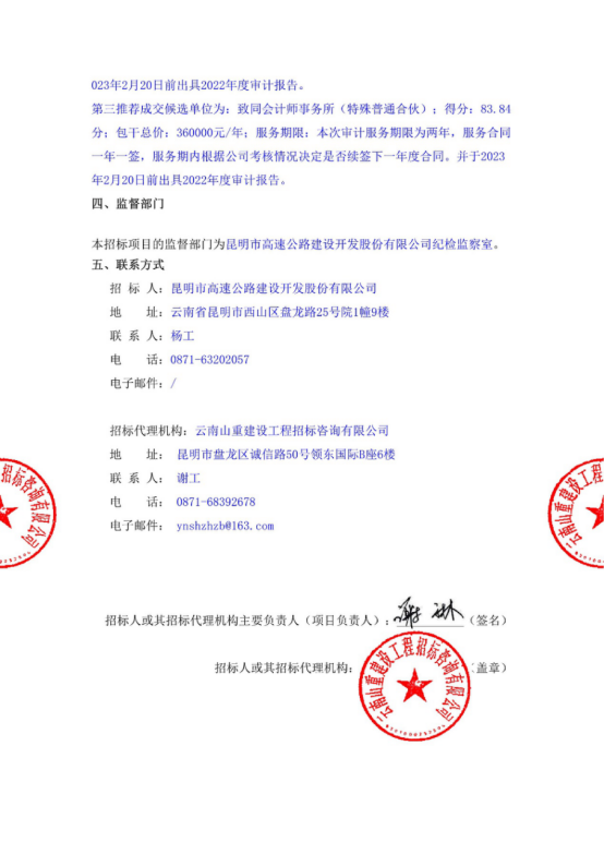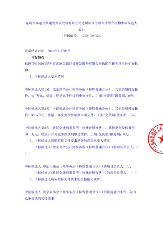 昆明市高速公路建设开发股份有限公司选聘年报专项审计中介机构中标候选人公示