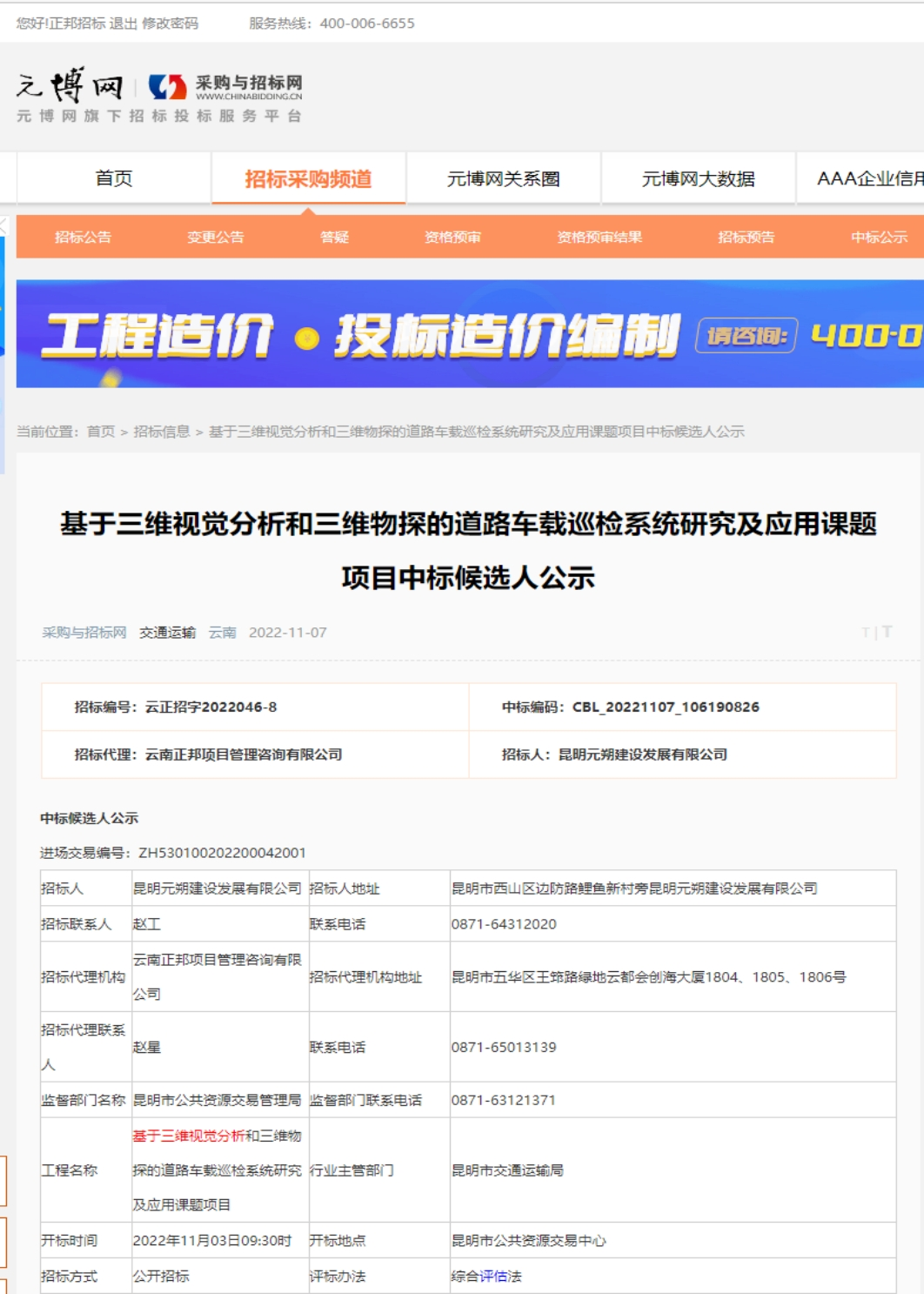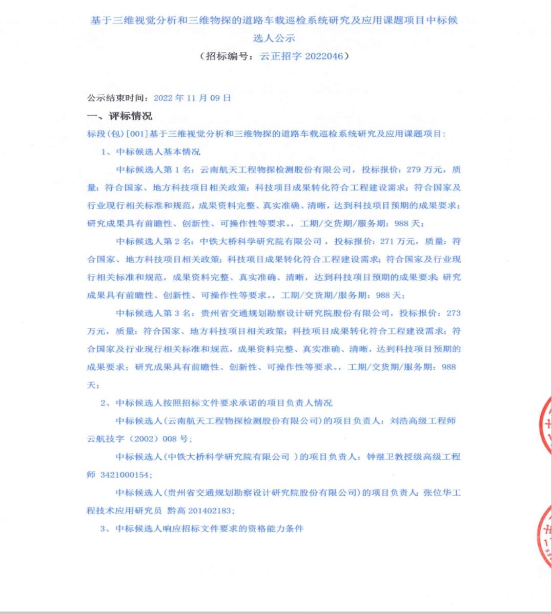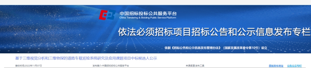 基于三维视觉分析和三维物探的道路车载巡检系统研究及应用课题项目中标候选人公示